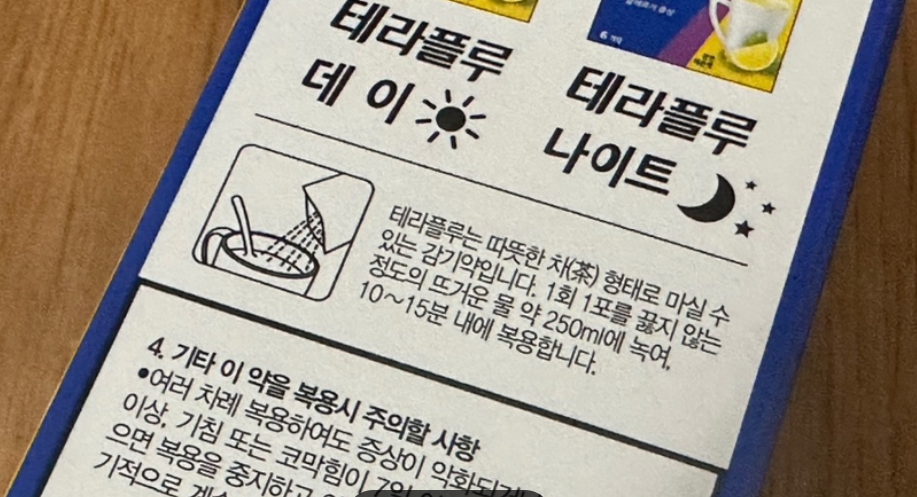 테라플루는 일반 종합감기약들의 알약 형태와는 다르게 가루로 따뜻한 물에 녹여야 합니다.