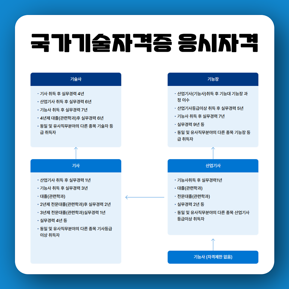 기능사는 자격요건이 없지만 나머지 기술사, 기사, 산업기사, 기능장은 자격요건이 있습니다.